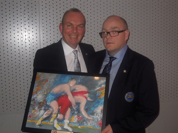 SBF överlämnar en litografi målad av Farstakonstnären Kalle Höglund, med bröderna Lidbergs autografer.