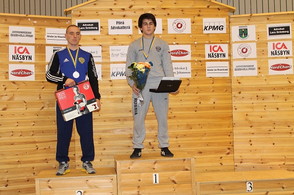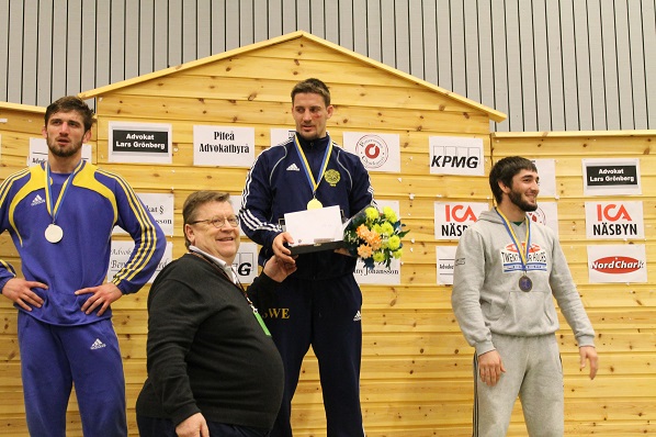 Prispallen i 74 kg Robert Rosengren och prisutdelaren Allan Dahlberg